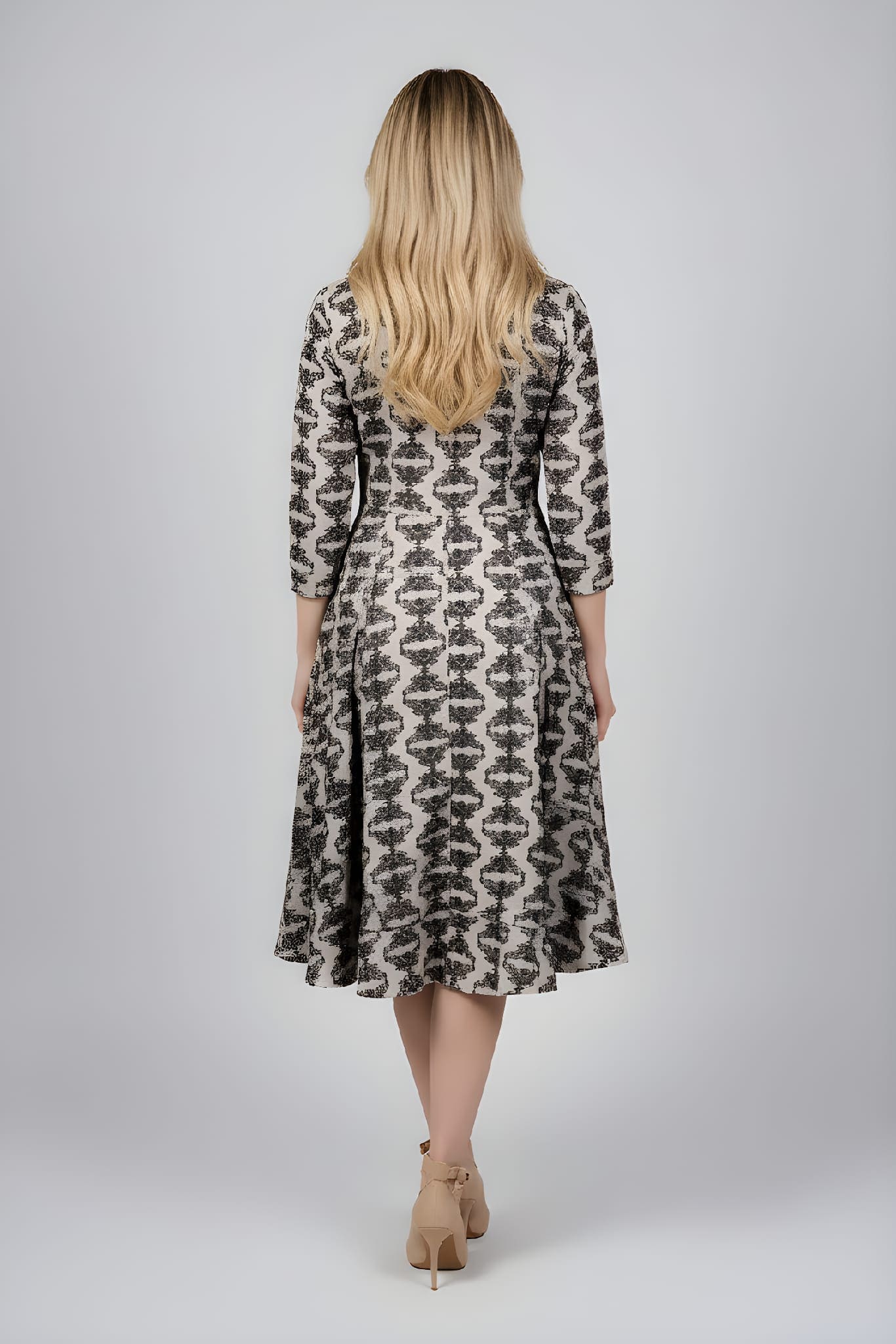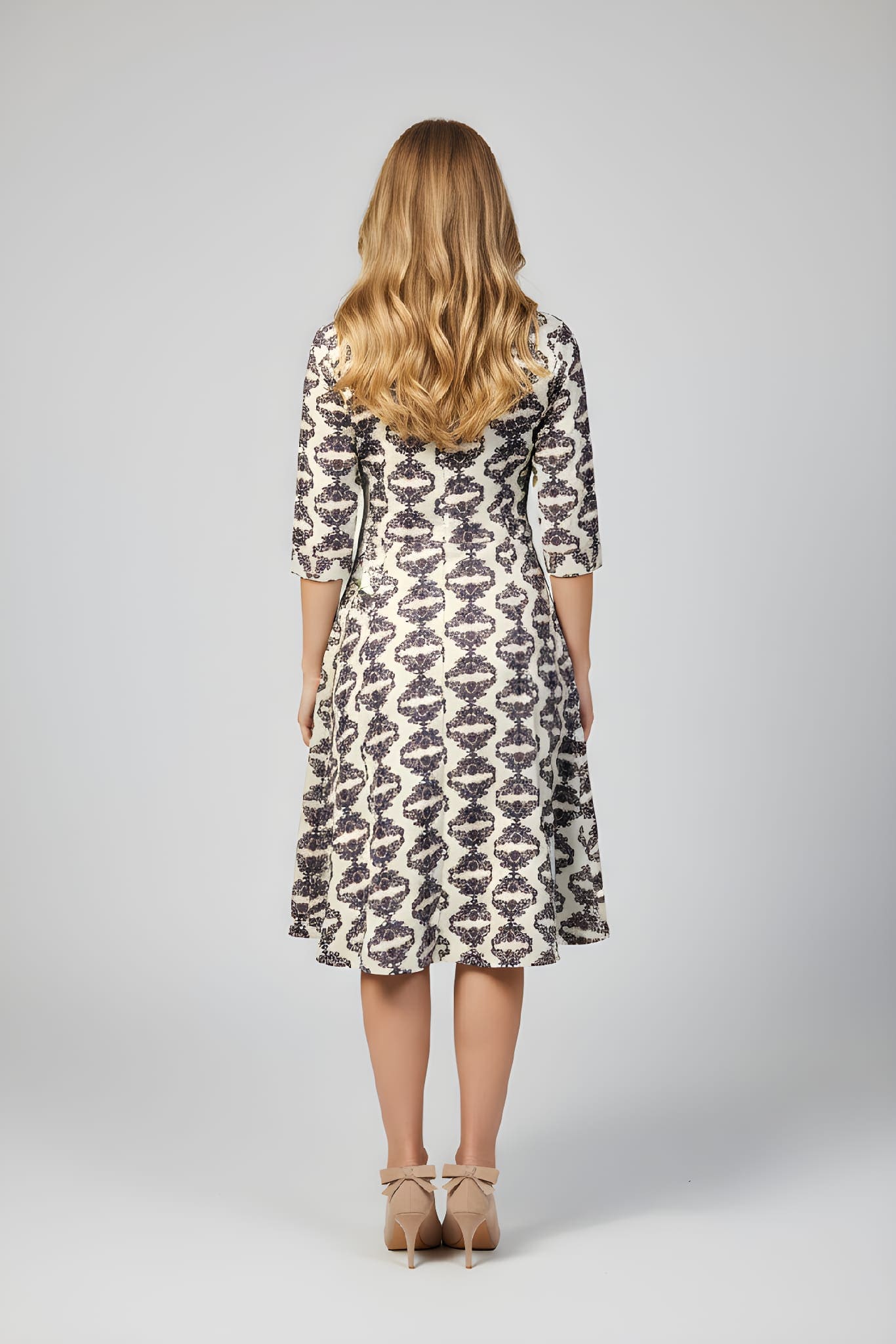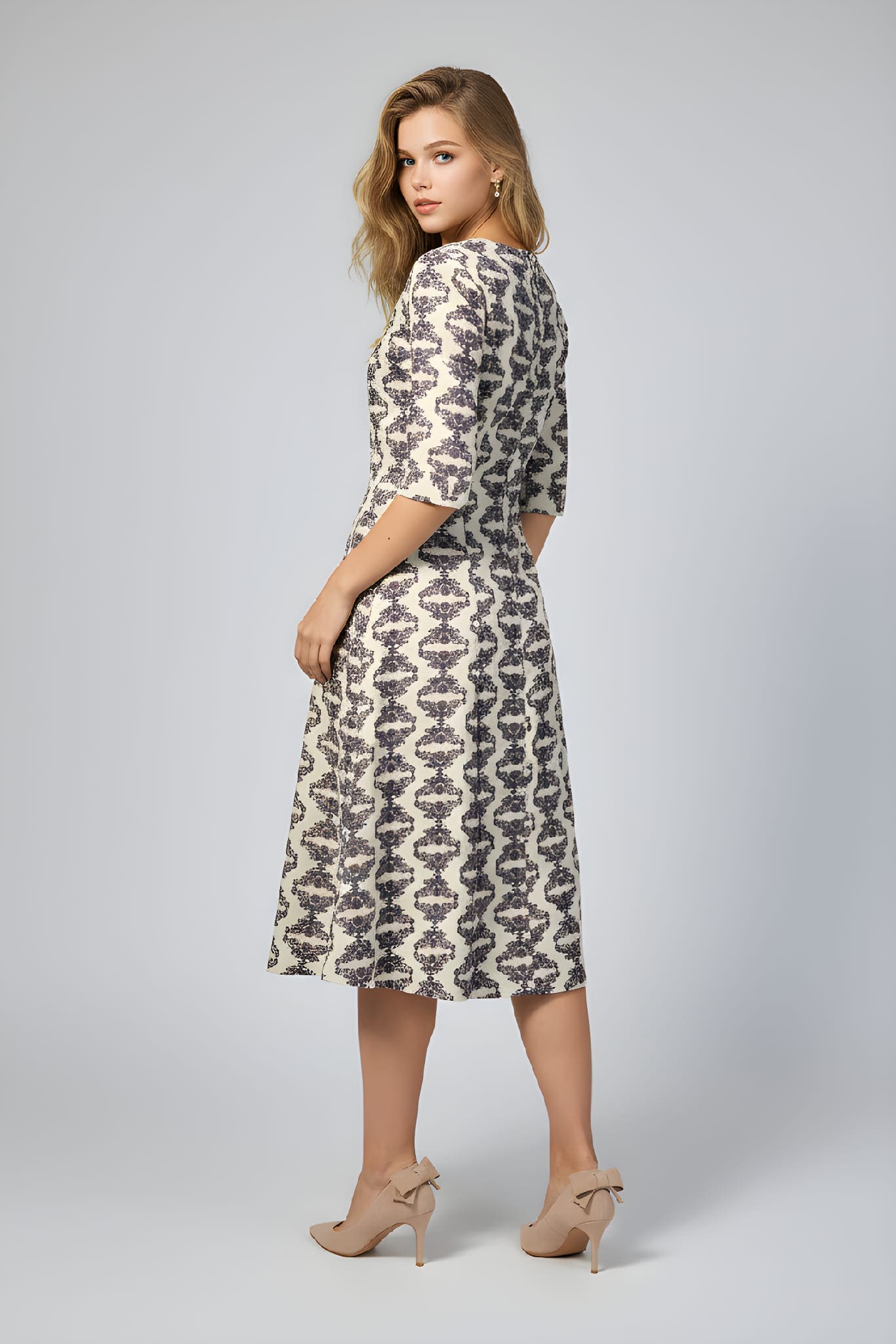 Presentamos la prenda estrella de la temporada: nuestro vestido midi estampado confeccionado íntegramente en 100% algodón. La combinación perfecta entre un tacto natural, transpirable y un diseño que estiliza la figura. Este vestido captura la esencia de un look chic y desenfadado. Su cuello redondo clásico y la manga 3/4 lo hacen ideal para el entretiempo o para un outfit de oficina con un toque de color. La falda con vuelo aporta un movimiento espectacular y una caída fluida que te encantará.