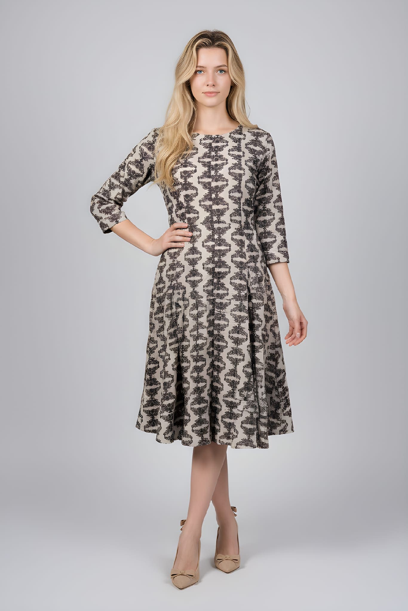 Descubre nuestro vestido midi 100% algodón con un diseño estampado vibrante, falda con vuelo y manga 3/4. Comodidad y estilo garantizados. ¡Imprescindible!